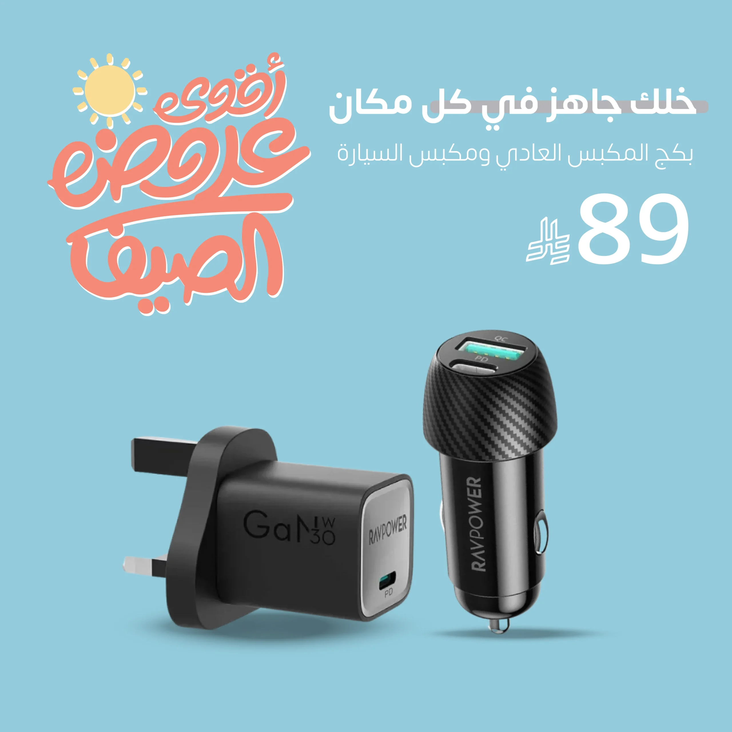 عرض ليلى تك: شاحن RAVPOWER الجداري 30W وشاحن السيارة 49W – طاقة فائقة لبيتك وسيارتك بـ 89 ريال فقط!