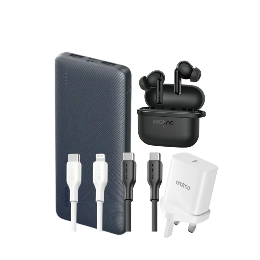 هذا هو البكج الشامل الذي صمم لتلبية كل متطلباتك التقنية! مجموعة ORAIMO 5×1 تقدم لك مزيجاً مثالياً من الطاقة الهائلة، الشحن فائق السرعة، وجودة الصوت الغامرة. استعد لرفع مستوى إنتاجيتك واستمتع بتكنولوجيا Apple و Samsung بأقصى سرعة. اطلب بكج ORAIMO المتكامل الآن من ليلى تك.
