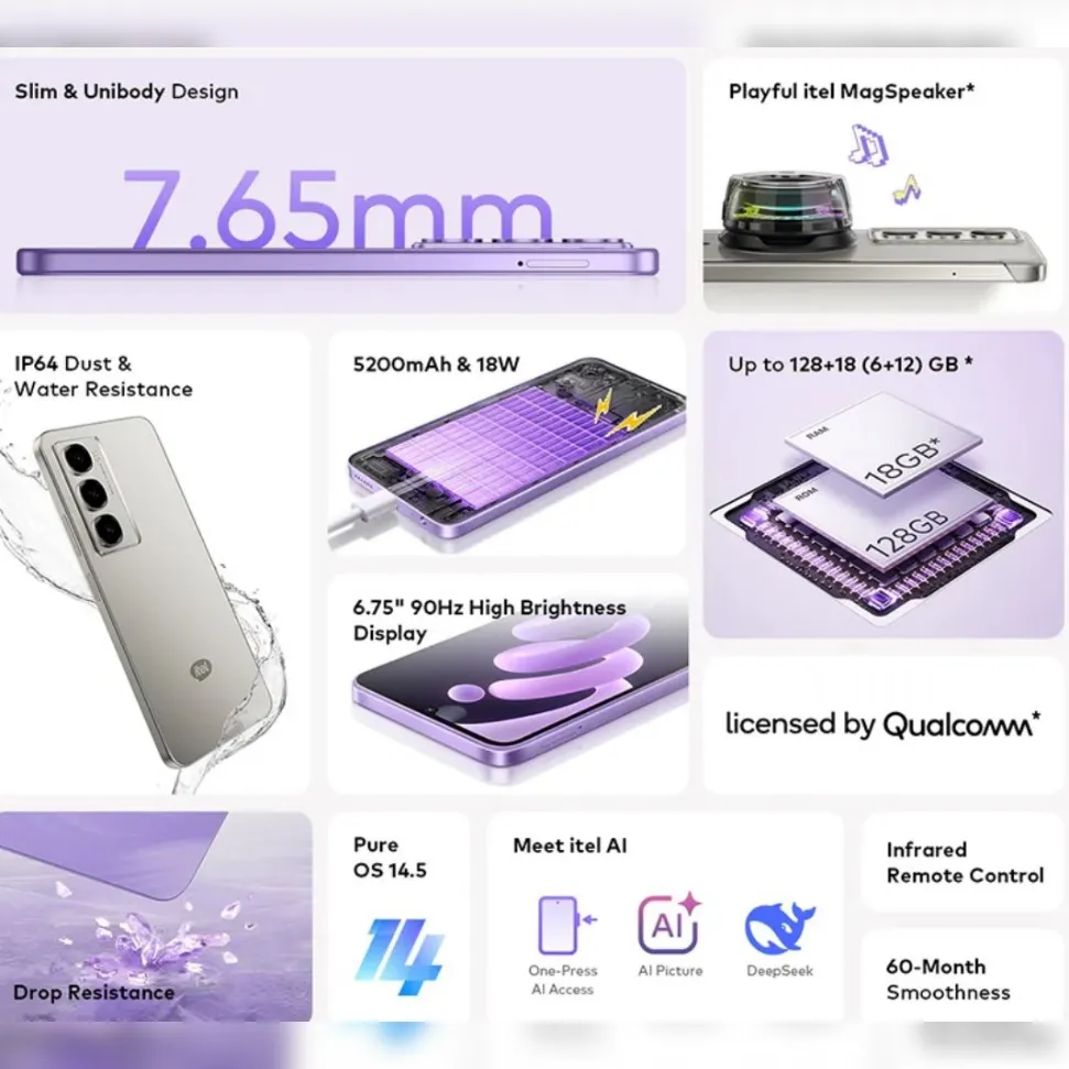 - ذكاء اصطناعي من itel AI: مع ميزات مثل One-Press AI Access، AI Picture، و DeepSeek لتحسين تجربتك.