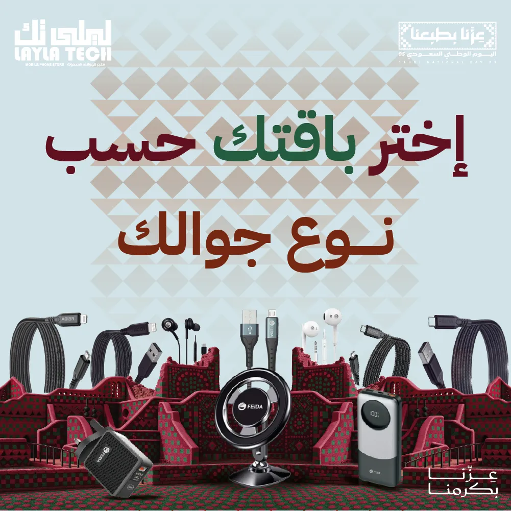 مع عرض اليوم الوطني من فيدا، اختر ما يناسب جوالك وتمتع بأداء قوي وسرعة فائقة مع ضمان الجودة من ليلى تك.